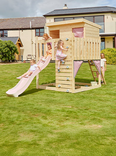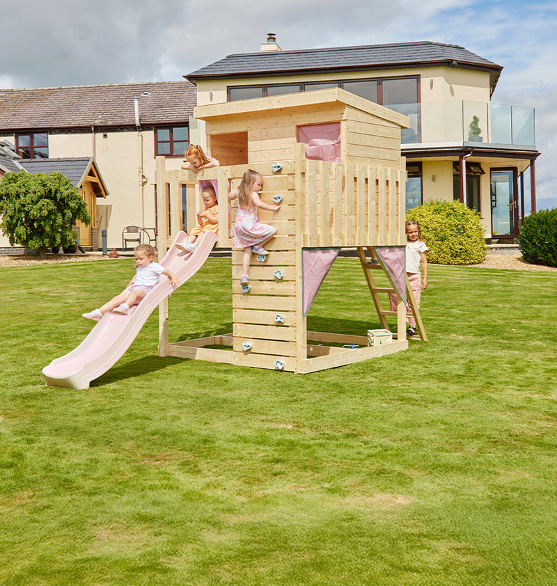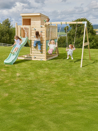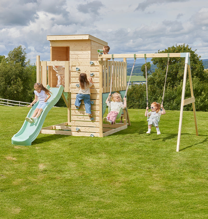 Wir versprechen dir eins: Wir haben für jede Grundstücksgröße die passenden Outdoor Spielgeräte. Wenn du nur einen kleinen Garten hast, kannst du dich für ein Spielhaus oder eine einzelne Rutsche entscheiden. Wenn du stattdessen ein vielfältiges Spielgerät suchst, das verschiedene Spielangebote vereint, sind unsere Klettertürme und Klettergerüste ideal. Sie laden mit Rutsche und Schaukeln zum ausgelassenen Toben ein. Teilweise halten unsere Klettertürme auch ein kleines Spielhaus bereit, in dem Kinder in verschiedene Rollenspiele eintauchen können. Alle Outdoor Spielgeräte aus unserem Haus bieten dir zudem die Möglichkeit, diese individuell nach den Wünschen deines Kindes zu gestalten.