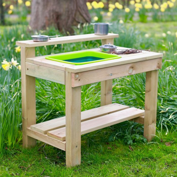 - Matschküche aus Holz: Basisversion mit Arbeitsplatte und Sandtrog.