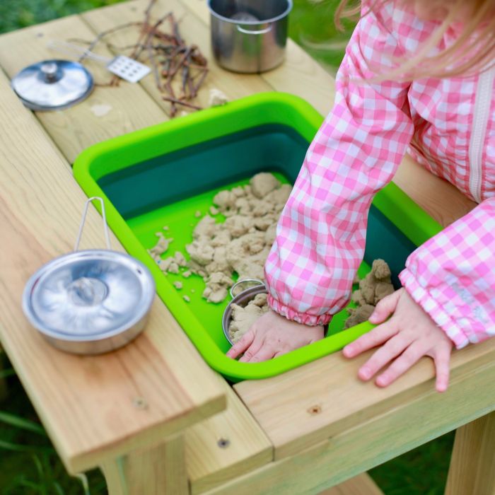Matschküche oder Matschtisch sind Mini-Sandkästen, die einer Spielküche nachempfunden sind, wie du sie fürs Kinderzimmer kennst. In der Regel gibt es eine Arbeitsfläche, in die mindestens ein entnehmbarer Trog eingelassen ist, der mit Sand befüllt wird. Das Kind „arbeitet“ im Stehen mit dem Sand und kann dabei genau nachahmen, was es bei den Großen in der Küche beobachtet. Matschküchen-Zubehör, wie Sandförmchen oder Spielküchengeschirr, macht das Spielerlebnis perfekt. Der Sandbehälter lässt sich alternativ mit Wasser füllen. Der „Wassertisch“ wird dann in der Fantasie des Kindes zum Beispiel zur Spüle oder zum Schwimmbecken für Wasserspielzeuge.