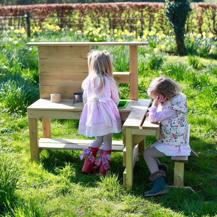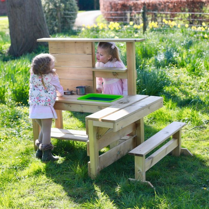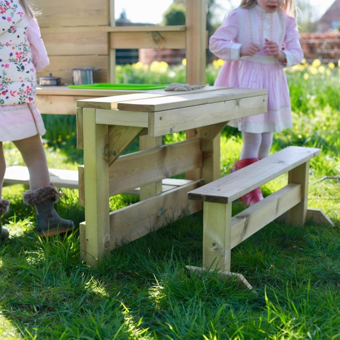 - Matschküche mit Regal, Tresen und Sitzbank: Abstellfläche und Sitzgelegenheit für kleine Köchinnen und Köche sowie ihre Gäste.