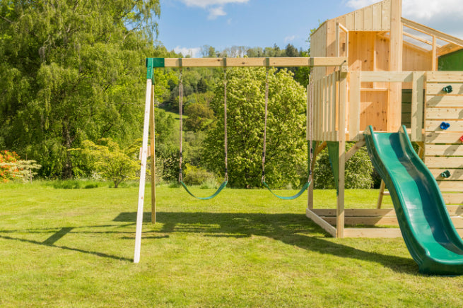 Bei OutdoorToys sind neben den beiden Klassikern, dem einzelnen oder doppelten Schaukelgestell, auch kombinierte Outdoor-Spielgeräte aus Holz erhältlich. Damit kommt zu Hause sofort ein Gefühl von Spielplatz auf.