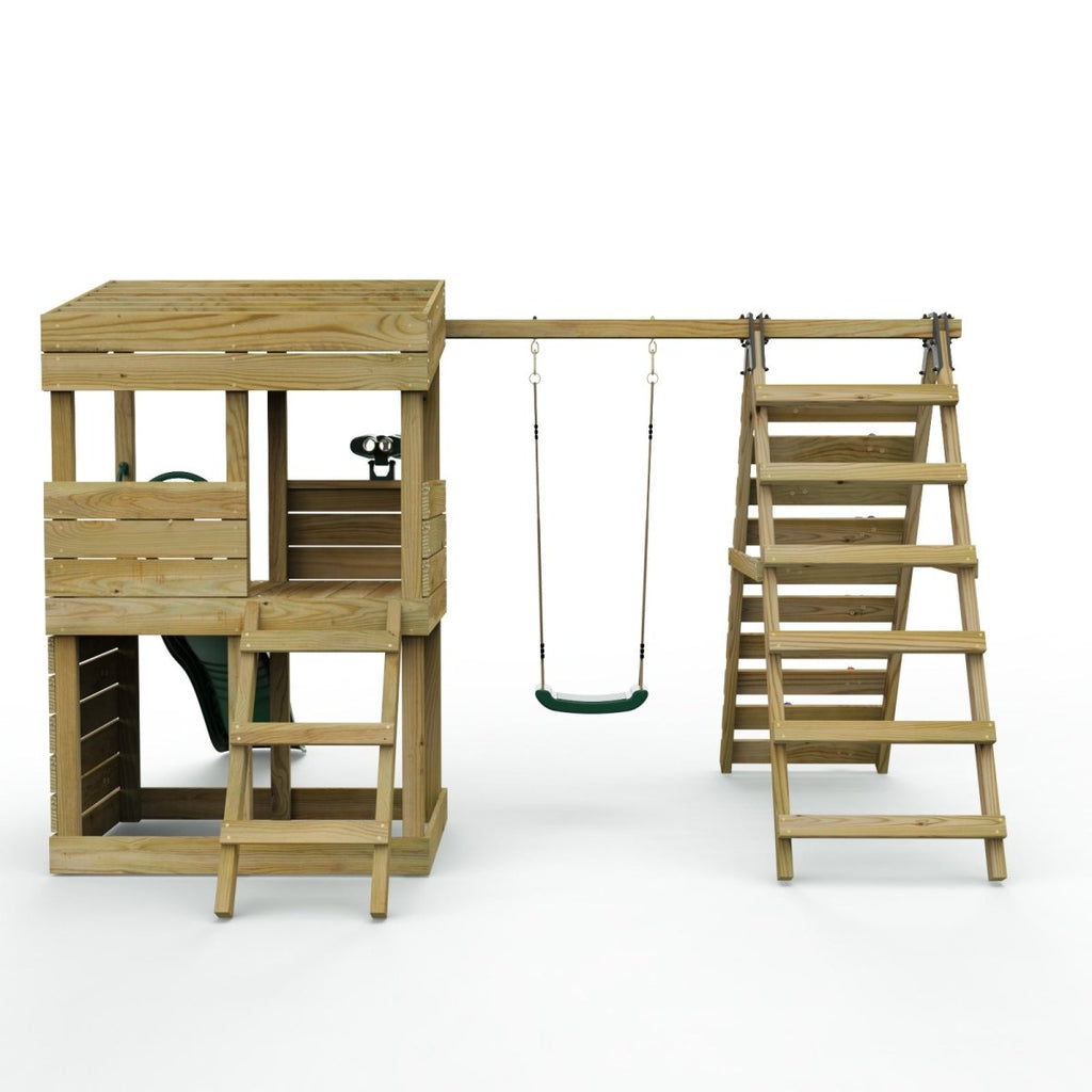 Der Kletterturm besteht aus druckimprägniertem Holz und kommt mit einer robusten, 180 cm langen Spritzgussrutsche für schnelle und spaßige Fluchten. Im Lieferumfang enthalten ist das beliebte Abenteuerset, das das Spielen im Freien noch spannender macht. Mit dem einzelnen Schaukelarm samt normalem Schaukelsitz sowie der integrierten Kletterwand bietet der Turm jede Menge Abwechslung. Eine stabile Leiter ermöglicht einen einfachen Aufstieg, während Sicherheitsgriffe an der Kletterwand zusätzlichen Halt geben.