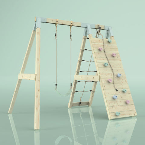 Kletterwand mit eisblauen Klettersteinen und Metallverbindungen bei allen Farbvarianten